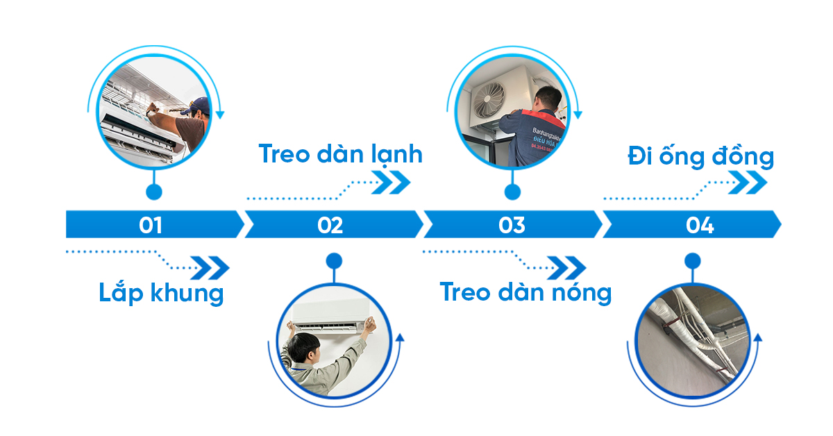 Mỗi công trình đều được khảo sát chi tiết, lên bản vẽ thi công, sau đó tiến hành lắp đặt theo quy trình chặt chẽ: đặt dàn lạnh, đi ống đồng, kết nối dàn nóng, hút chân không, chạy thử và bàn giao. Từng khâu đều có sự giám sát kỹ thuật để đảm bảo hệ thống vận hành trơn tru.
